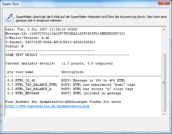 - Vor dem Newsletter-Versand können Sie Ihre E-Mail auf Spam-Bestandteile z.B. bestimmte Worte, Schriftfarben, Schriftformatierungen und den SPF-Record durch SuperMailer testen lassen.